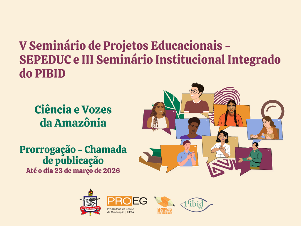 A Pró-Reitoria de Ensino de Graduação (PROEG) da Universidade Federal do Pará (UFPA) informa que foi prorrogado até o dia 23/03/2026 o prazo para submissão de trabalhos completos apresentados no V Seminário de Projetos Educacionais e III Seminário Institucional Integrado do PIBID.