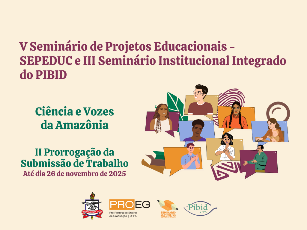 A Pró-Reitoria de Ensino de Graduação (PROEG) da Universidade Federal do Pará (UFPA) convida discentes bolsistas e voluntários/as, coordenadores/as, orientadores/as, supervisores/as, atuantes nos Programas Labinfra, Monitoria, Monitoria Voluntária, Tutoria Discente, Programa de Educação Tutorial (PET) e PIBID, bem como a comunidade acadêmica em geral, para o V Seminário de Projetos Educacionais e III Seminário Institucional Integrado do PIBID, a ser realizado no período de 16 a 19 de dezembro de 2025 em formato remoto.